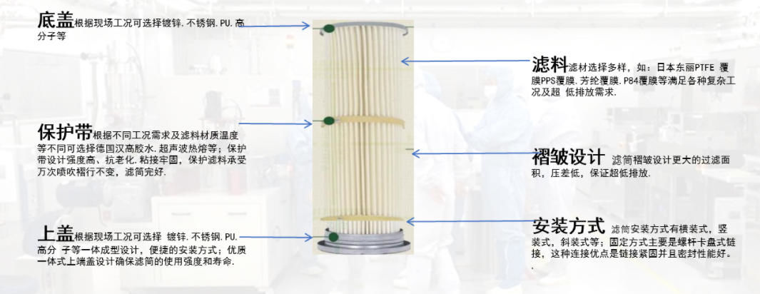 粒度細、密度小的塵粒進入過濾室,通過布朗擴散和纖維攔截等綜合效應,使粉塵 沉積在濾簡的濾料表面,凈化后的氣體進入凈氣室內,由出風口經風機排出。濾簡 除塵器的阻力隨著濾筒的表面面積增加而變大,當阻力達到一定的設定值時,通過 反吹系統(tǒng)脈沖閥經噴吹管的小孔,噴射出-股高速高壓氣流,進行清灰。此時 PLC 程序控制脈沖閥的啟閉,當脈沖閥開啟時,氣包內的壓縮空氣通過文氏里管 的擴充,均勻的進入濾筒內部在濾筒內部形成瞬間的正壓,產生巨大的震動,使沉積在濾料上的粉塵脫落,掉入灰斗內,收集的粉塵通過卸灰閥,排出到灰筒內。*上排濾筒會首先脈沖反吹,然后控制儀選擇下排重復脈沖反吹過程此后此 控制儀會順序繼續(xù)選擇其他濾筒進行脈沖反吹操作。
